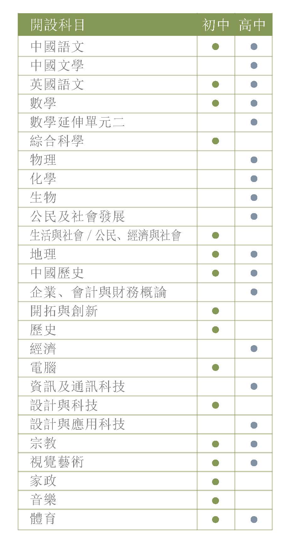 本校初高中開設不同的科目,初高中課程亦強調 「螺旋式」課程銜接。高中選修科目與初中課程設計及教學活動互為配合,讓學生提前接觸高中課程的基礎內容,以便他們更進一步瞭解個人未來學習的方向,有更完善的學習計劃及準備。