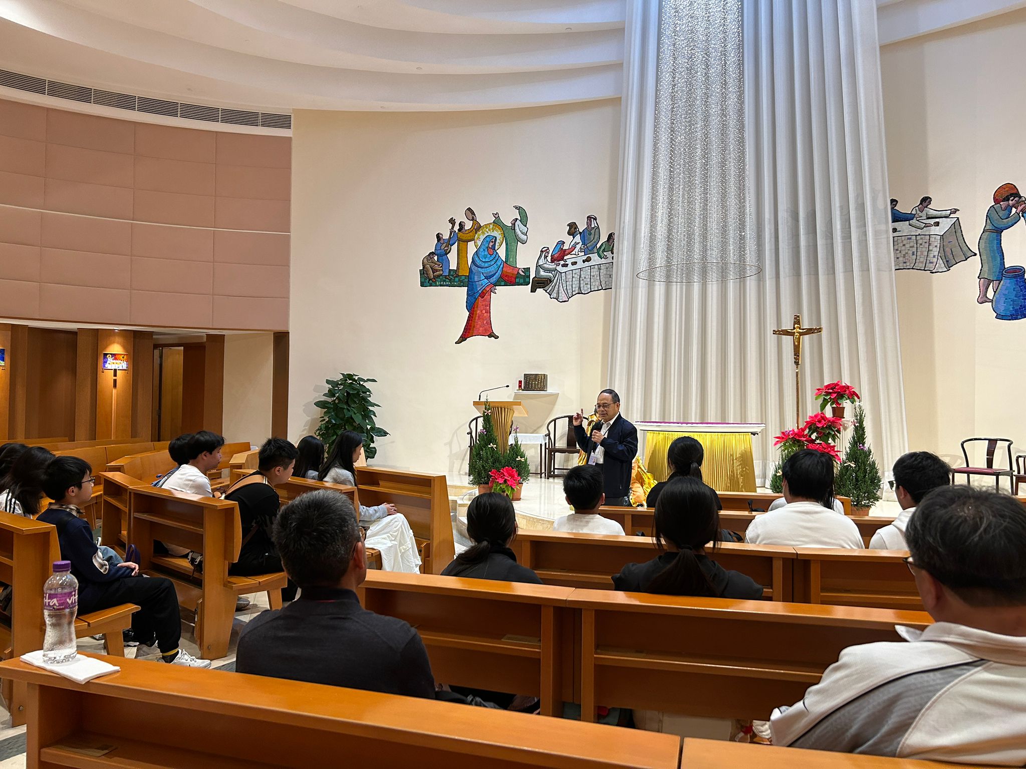 我們進入這座融入社區的現代聖堂,感受聖堂中的扇形設計;從祭台流向聖洗池的活水,象徵「恩寵」的湧流;堂內源自舊堂的鐘聲與壁畫,更讓我們領悟到教會作為眾家之家,如何在服務與愛德中延續使命。