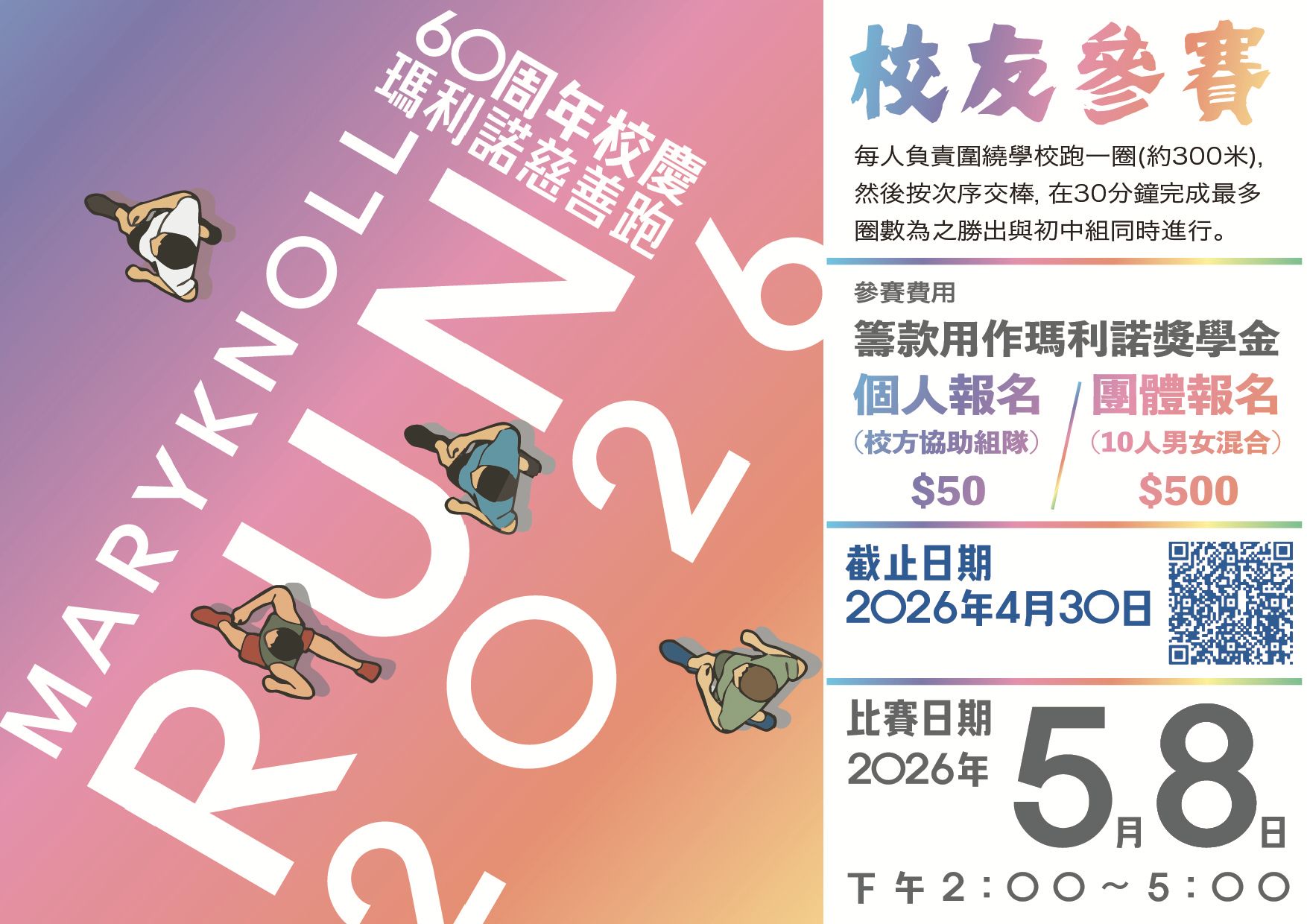 為慶祝瑪利諾中學60周年校慶,誠邀各位校友踴躍參加瑪中年度運動盛事「瑪利諾慈善跑 Maryknoll Run 2026 」!慈善跑活動場面熱鬧,氣氛熾熱,絕對是一場結合挑戰、團隊精神與校友情誼的盛會!