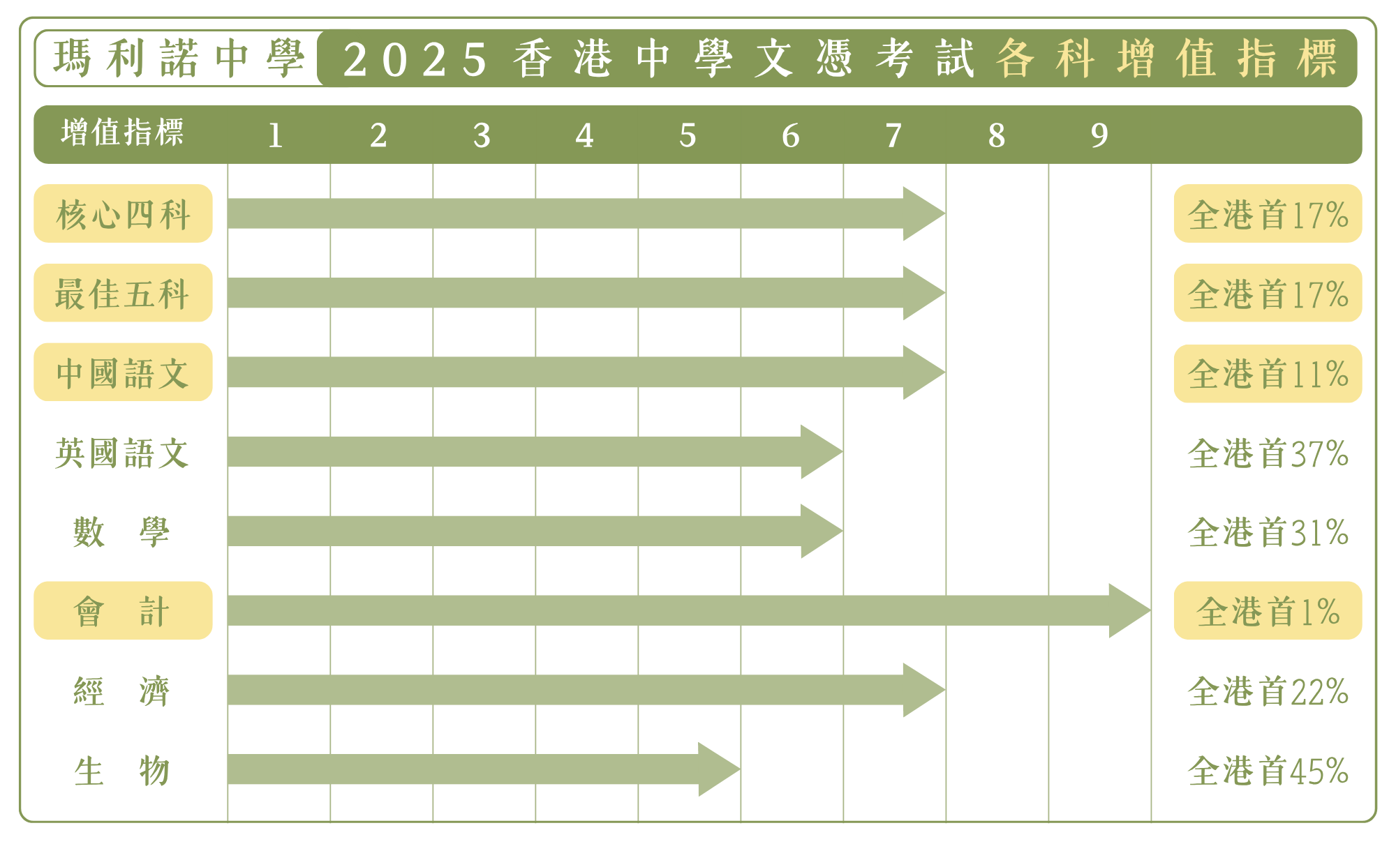 本校同學於2025年文憑試增值表現殊佳,獲教育局評定之科目大部份均為正增值。當中最佳五科獲教育局評定七級增值,核心四科和中國語文達七級,會計科更達九級增值。