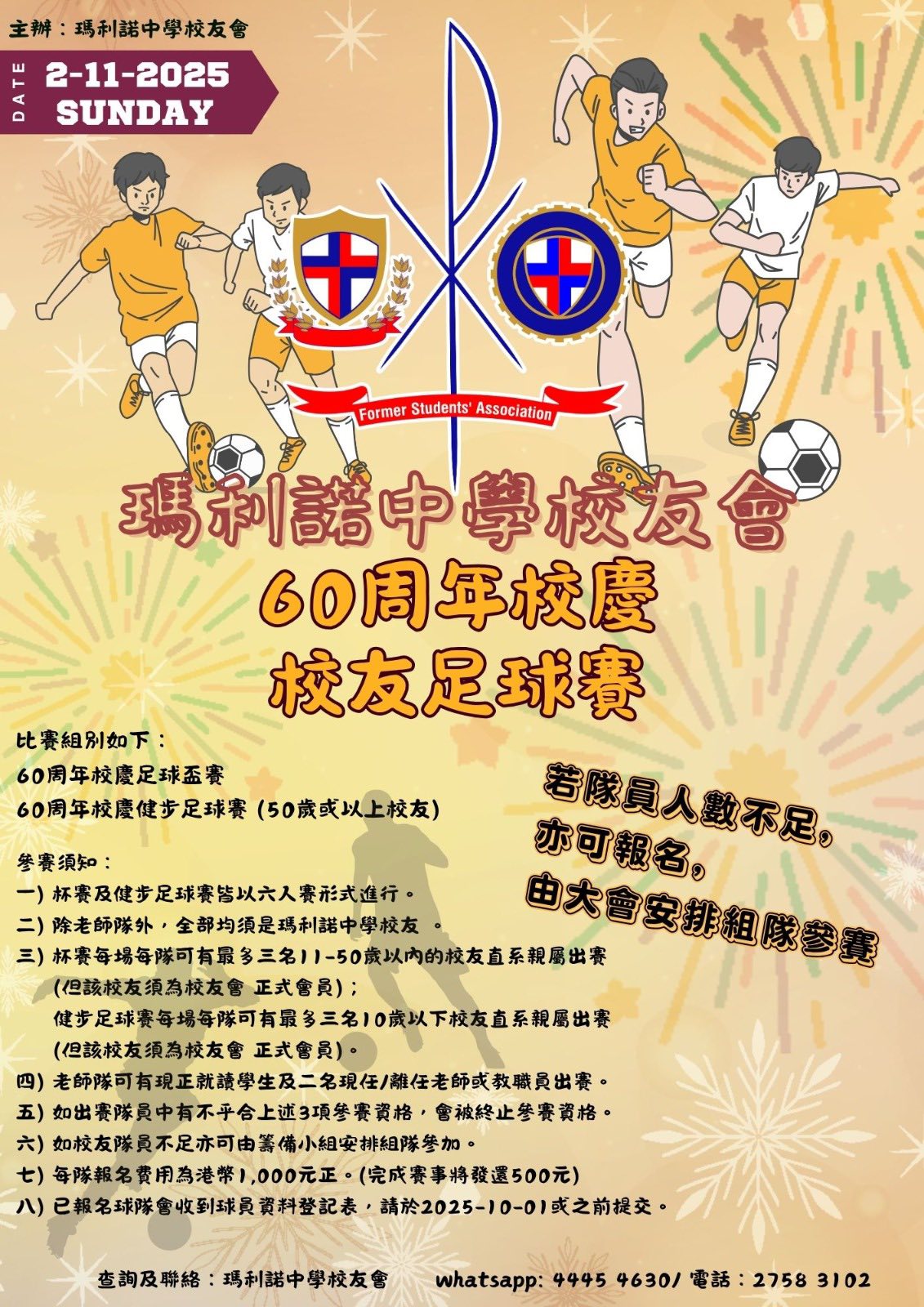 為慶祝瑪利諾中學校友會創校六十周年,校友會於2025年11月2日(上午九時至下午五時)成功舉辦校友足球賽。賽事彙聚了橫跨半世紀的十二支校友隊伍,其中包括首次增設的四支健步足球隊伍,現場氣氛熱烈,充分展現了瑪利諾精神的傳承與活力。